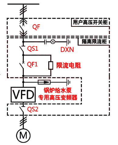 希望森蘭為鍋爐電動給水泵拖動系統電動機配置的是給水泵專用變頻調速系統。系統針對鍋爐給水泵運行的特點和要求設計,完全符合鍋爐給水泵的運行特點。系統一次主回路方案選取一拖一帶限流柜方案,滿足系統穩定運行要求的同時消除了高壓上電時對系統的沖擊。