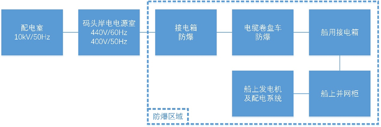 2016年底,由希望森蘭科技股份有限公司與上海艾臨科智能科技有限公司聯合為嘉港石化碼頭提供了全新設計的專用于危險區域的SB70防爆型智能岸電電源系統解決方案。該系統將10kV/50Hz電源轉變為440V/60Hz及400V/50Hz可變雙頻雙壓輸出至碼頭防爆接電箱,需要連船時將接電箱與移動式防爆電纜卷盤車連接,再由卷盤車將電纜舉升至改造后的船用接電箱處連接,進行岸電向船電的輸送。