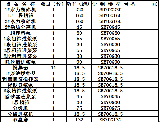 造紙生產(chǎn)線上的輔機很多,為節(jié)能基本都需要變頻調(diào)速。實踐已經(jīng)證明,造紙輔機實施變頻調(diào)速后,平均節(jié)能在12%,經(jīng)濟效益明顯。浙江富陽某造紙廠生產(chǎn)線上的部分輔機設備如下表:
