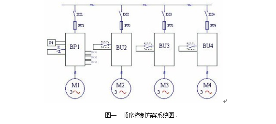 由于城市自來水的用量隨季節的變化而變化,隨每日時段不同而變化。為使供水的水壓恒定,最常見的辦法是采用變頻恒壓供水系統,即壓力變送器裝在主管網上檢測管網壓力信號,再將此壓力信號送到變頻器(PLC)的模擬信號輸入端口,由此構成壓力閉環控制系統,管網壓力的恒定依賴變頻器的調節控制。對于多泵情況,可以兩種不同的控制系統方案,一種是“順序控制方案”,系統圖如圖一所示: