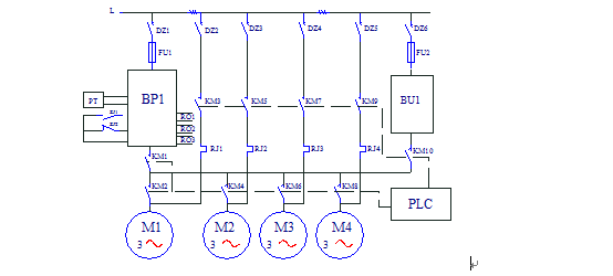 圖中:BP1—變頻器;BU2~BU4--軟起動器,PT—壓力變送器。由圖一可見,變頻器連接在第一臺水泵電機上,需要加泵或減泵時,由變頻器RO1~RO3端口輸出信號起動或停止其他的水泵,這時水泵的起動采用自耦降壓起動裝置或軟起動器。這種方案的特點是水泵電機不需要在變頻和工頻之間切換;第一臺水泵永遠連接在變頻器上,沒有切換過程中的失壓現象;由于變頻泵以外的泵都有軟起動器,所以不需要再做備用系統,當變頻器故障時,可用軟起動器手動起動M2~M4水泵,保證供水不致中斷;每臺電機都有起動器,初始投資較大。另一種是“循環投切”方案,系統圖如圖二所示