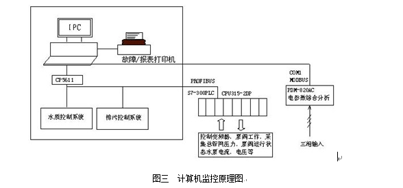為保證系統的可靠性,上位機PC用于管理,用組態軟件做出若干工藝流程圖,實時顯示系統的運行狀況,并統計歷史數據,如需要可隨時打印報表;還用于故障的報警和處理。PC機為研華工業計算機,PLC為西門子S-7300,便于與總控室計算機聯網,采用帶有PROFIBUS接口的CPU315。CP5611是通信模塊,PDM-820AC電參數綜合分析儀用于檢測系統的用電量。控制水泵的起/停,切換,閥的啟/閉;電機電流,溫度的檢測,水泵使用時間的統計;壓力,流量,水質參數的采集等,均由PLC完成。水壓的給定值由變頻器鍵盤設定。
