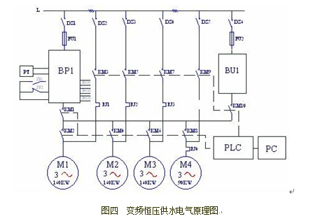 四川遂寧市自來水二廠,供水能力6萬噸/日,城市管網壓力0.4MPa,泵組為3臺160kW,1臺90kW水泵,要求恒壓供水并采用計算機監控,變頻器或控制系統故障可由軟起動器手動起動各泵。