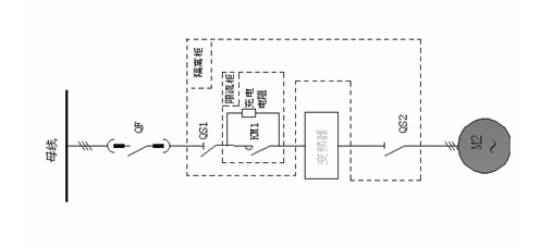 送水泵變頻改造系統(tǒng)包括三部分:隔離柜、限流柜、高壓變頻器。其中隔離柜由兩個隔離開關(guān)組成,當(dāng)變頻器處于檢修和維護狀態(tài)時,通過手動操作分?jǐn)郠S1,QS2開關(guān),確保檢修過程的安全性。當(dāng)需要對電機進(jìn)行絕緣耐壓試驗時,需要將QS2分?jǐn)啵囼炌戤叄偈謩訉S2合閘。