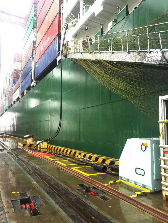 隨后EVER LISSOME LONNON號(hào)船上工作人員開始放船用連接高壓電纜,岸上工作人員將高壓電纜連接到港口#14泊位區(qū)岸電接線箱,EVER LISSOME LONNON具有連接岸電條件。